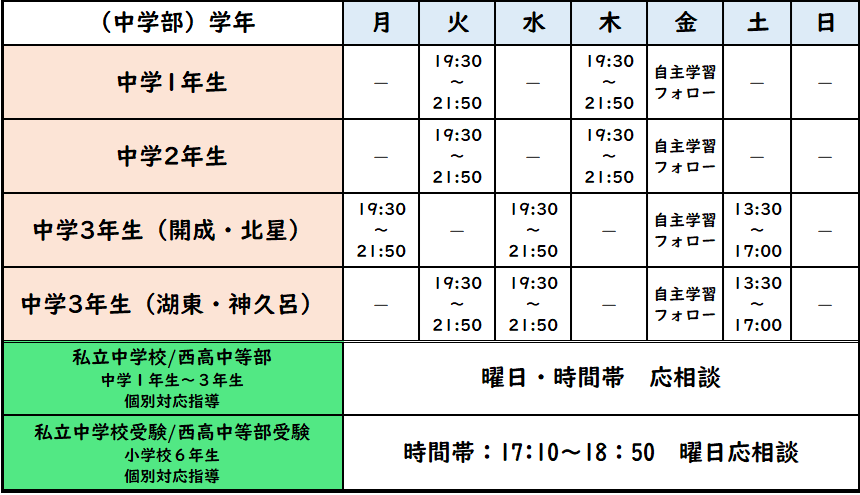 ※自主学習フォロー ・・・ 当塾の無料サービスで、原則全員参加していただきます。学校ワークだけでなく学校で出されたプリント等による学習(内申点対策)を支援します。週2回でもOKです。この時間帯に来て勉強すれば、実質週3回以上の通塾になります。