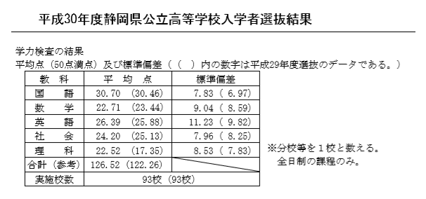 テスト 平成30年度 入試結果 2018年4月10日 / 以下の情報が静岡県教育委員会より発表されました。 予想通り、今年度入試も平均点が低く、難しい問題だったといえます。 国語以外の4教科の平均点が低く、この難易度はこのまま続くと予想されます。 この春に新中学3年生になった生徒たちは、今は修学旅行のことで頭がいっぱいです。受験と言っても、まだかなり先の話と思っていることでしょう。 しかし、難化する入試問題に対応するため、今年度の入試対策プランを今から再修正していきます。