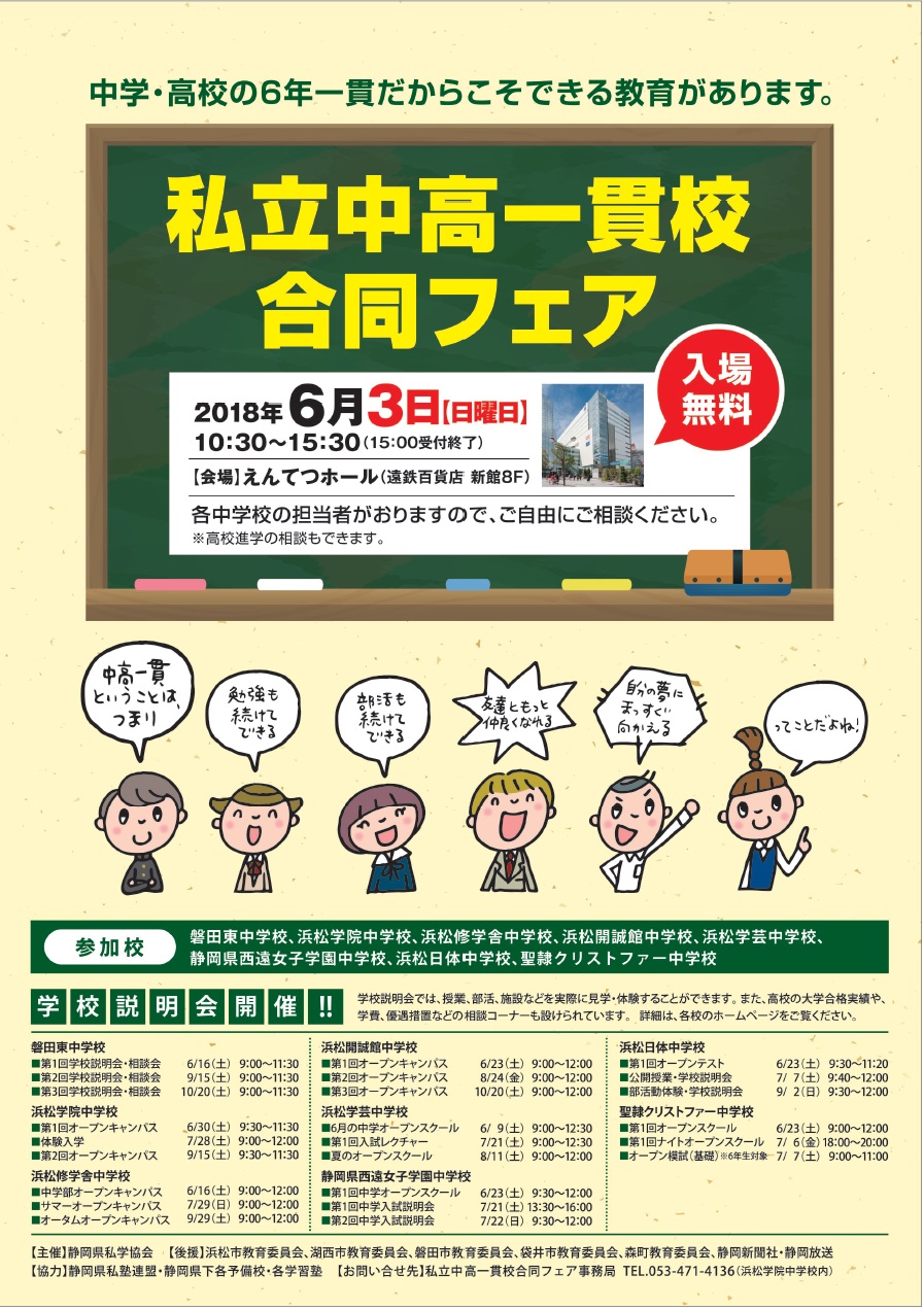 テスト 6月3日「西部地区私立中高一貫校合同フェア」が開催されます 2018年5月6日 / 今年度も、6月3日(日曜日)に「西部地区私立中高一貫校合同フェア」が開催されます。 会場はえんてつホールです。 このフェアでは、各私立中学校の現場の先生方が相談に乗ってくださいます。この機会に「話を聞いてみたい」と塾生の中で興味をもたれた方はお気軽に講師までお声をおかけください。