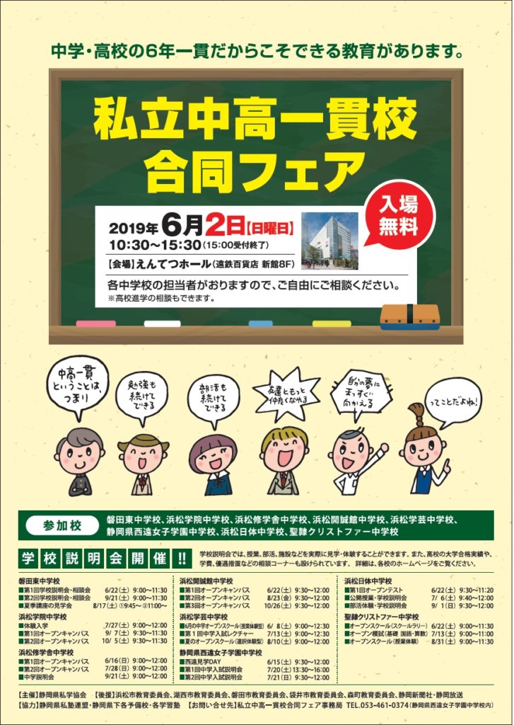 重要なお知らせ 【小学校6年生向け】私立中高一貫校説明会 2019年5月22日 / 当塾ホームページ、並びにブログ記事をご覧いただきありがとうございます。 ご案内です。 今年も、静岡県西部地区の私立中高一貫校の合同フェアが、6月2日(日)にえんてつホールで開催されます。 近年、地元の公立中学ではなく、早い段階から私立中学校に進学するという選択肢が定着してきました。 興味のある方はぜひ足を運んでみてください。